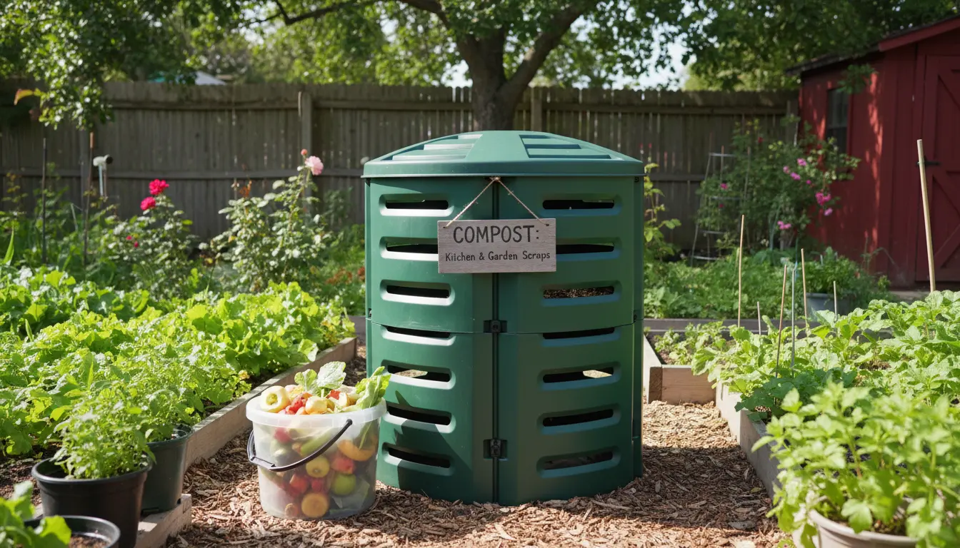 - Compost tumbler: enclosed and easy to turn; faster results with regular tumbling.